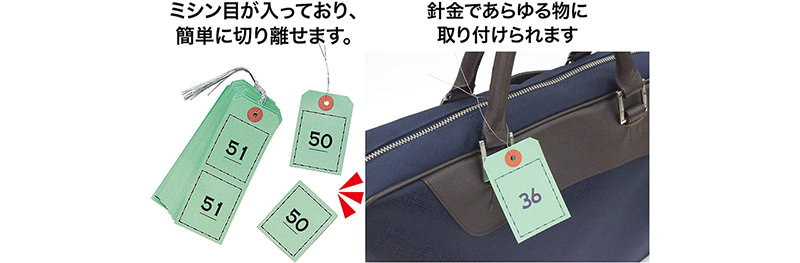 この荷札は二つに分かれます。ひものついた方を荷物に巻き付け、もう片方は荷物の本人確認用(照合用)として持ち主が管理してください。